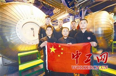 6名潜水员准备进舱(前排左起为董猛、胡建、李洪健,后排左起为管猛、谭辉、罗小明)。郭一江 摄