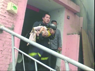 这真的是一组如网友所说“让人热血沸腾”的照片。组图中,一名消防战士身穿战斗服,背着“氧气瓶”,头部却没有任何保护器具。他怀中抱着一名婴儿,迅速跑出居民楼楼洞。在他身边的楼间小巷里,还可以看到烟雾涌出。在这名战士怀里,一名婴儿身上裹着毛巾,头部被全部包进了呼吸面罩里。