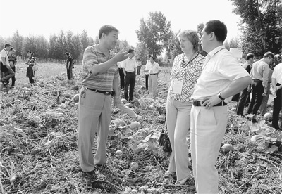 2010年,于海河(左)向俄罗斯客商介绍宝清白瓜生产情况。