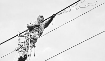 许启金在进行高压输电线路登高作业。 刘雪松摄(新华社发)