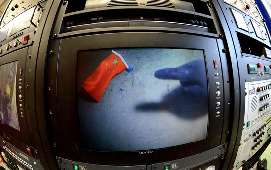 2014年1月12日中午,6号队员李洪健在全队完成深海潜水作业后,欣喜地南中国海313.5米海底插上一面五星红旗。文汇报记者郭一江摄