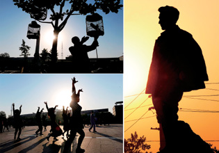 拼版照片:左上为兰考县城一个公园里晨练者在遛鸟(5月5日摄);左下为兰考县城晨练者在跳广场舞(5月5日摄);右为兰考县城一尊焦裕禄塑像(5月4日摄)。新华网记者 朱祥 摄
