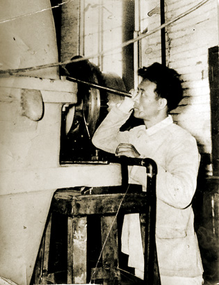 ▲1953年焦裕禄在洛阳矿山机器厂车间里凭听觉监测卷扬机的运转情况(资料照片)。