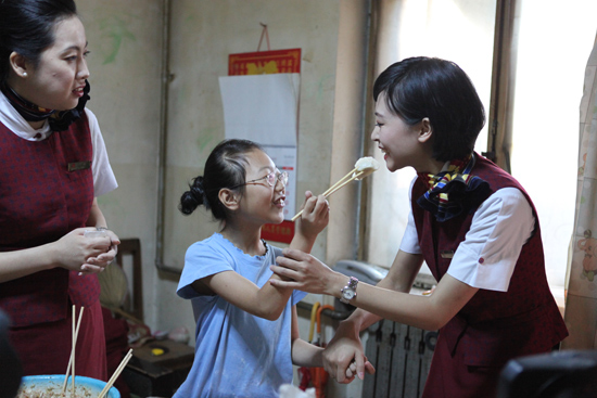 在很多人中间,金凤组的名字已经闻名遐迩,但人们并不知道,金凤组还有另外一个名字“金凤妈妈”。 首都机场南竺园社区有一位姜思然小朋友,3岁的时候,一场意外夺走了她的父母,金凤组主动与街道办事处联系,与她结成了长期帮扶对象,并主动承担她的入托费用。从2006年至今,已经9年时间,金凤组人员几经更替,对小思然的照顾却从来没有间断,她们定期与机场社区沟通联系,密切关注小思然生活、心理和学习情况,每年的春节、母亲节、六一和开学前夕,金凤组必去探望她,并为她带去礼物。金凤组乘务长魏莉娜的女儿和小思然年龄相仿,与小思然的接触中自然又多了一些感同身受的意味:“我第一次去看思然,是2011年,听说思然喜欢画画,就给她挑选了小黑板,带去彩色粉笔,当时正好是暑假,我把女儿也带上了,姐妹俩很快熟悉起来,告别时,思然依依不舍,在黑板上写下一行字:空姐妈妈,我要考100分。当我看到妈妈这个词时,真的很感动。我抱住她,怀里这个瘦瘦的小女孩彷佛就是我自己的女儿,对于孩子,当家长的永远都是不放心、不舍得,只要小思然有需要,我就会一直做她的‘妈妈’。”
