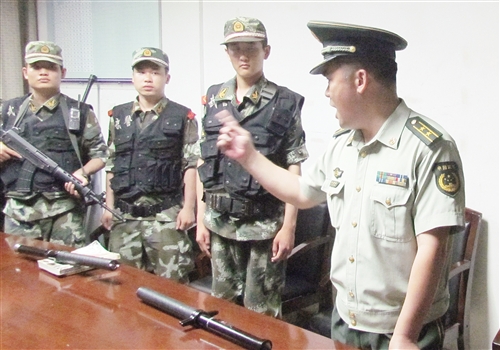 李威(左二)与战友们在受领任务。8月6日发病当天,原本没有任务的他主动替因感冒不适的战友到桂林火车站巡逻
