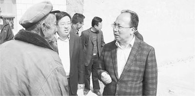 2014年5月,在临洮县中铺镇王家沟村调研时,柴生芳(右一)向村民讲解搬迁政策。资料图片