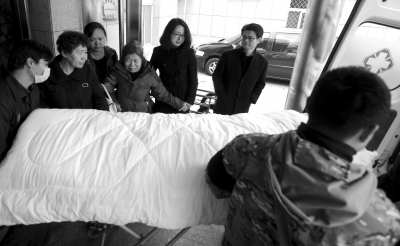 昨天下午,于尚清遗体被运上救护车。京华时报记者陶冉摄