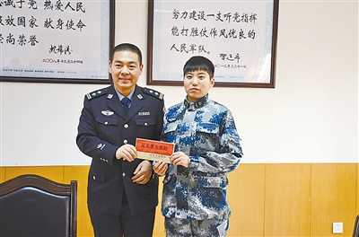 上图:公安部门领导给魏姣颁发“见义勇为”奖金。胡勇华 摄
