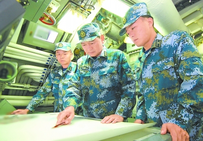 一次演练中,南海舰队某潜艇支队支队长王红理(中)在推演训练方案。新华社发