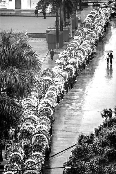 7时40分,莫校长的灵柩被抬出家门,前来送行的人们抬着花圈一路跟在莫校长灵柩的后方,排起一公里长的花圈阵。他们后面,还有约数公里长的送行队伍。