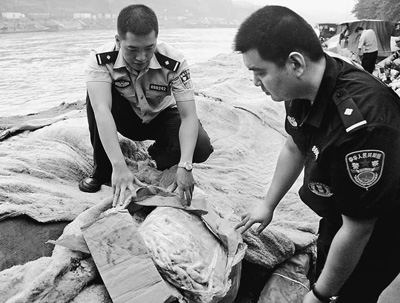 李顺麒(左)和同事在边境地区走私冻品查获现场。资料照片