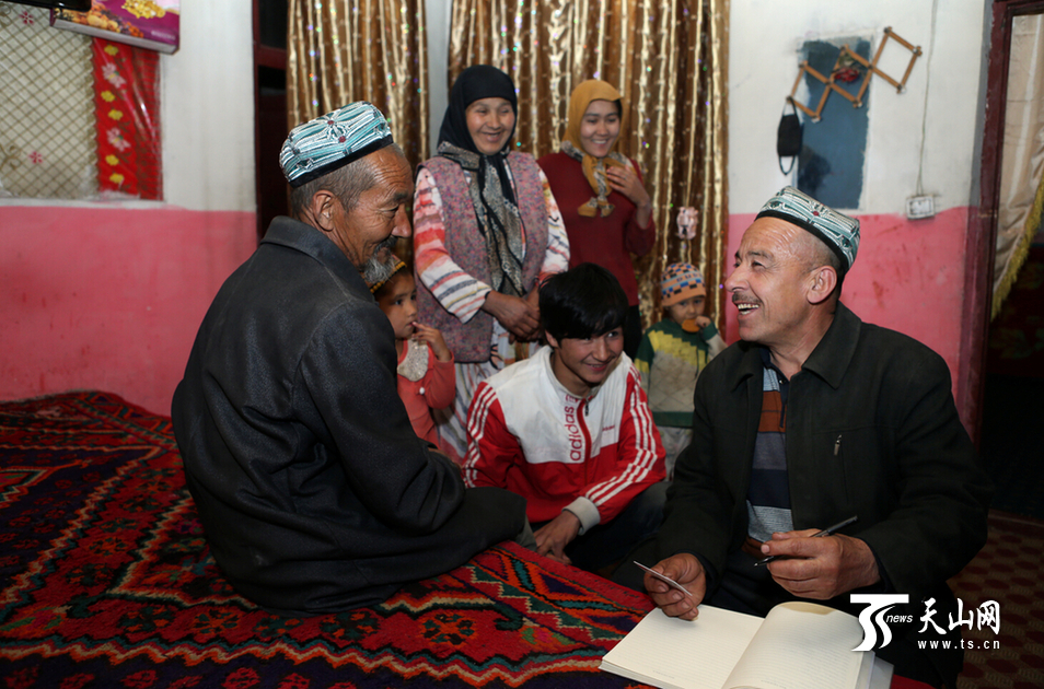 4月16日12时,在买吐肉孜·阿布都买买提家里,他正在为前来托他找工作的村民登记个人信息。