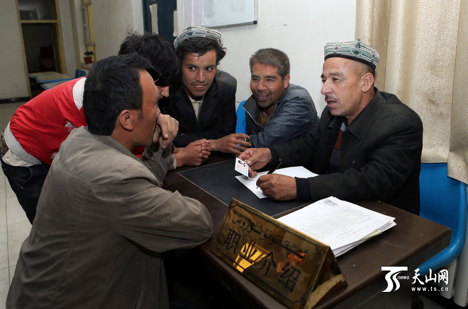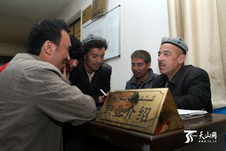 4月16日13时,布扎克乡民政社会保障服务所,买吐肉孜·阿布都买买提正向村民介绍职业信息。