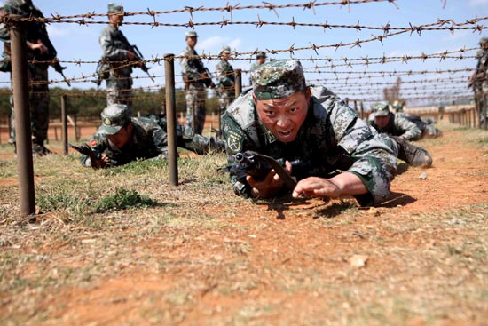 时任成都军区第13集团军某旅副参谋长的黎登贵在云南某外训地进行匍匐穿过铁丝网训练(2014年3月25日摄)。高效文/摄(新华社发)