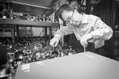 潘建伟在中科大上海研究院的实验室里调试设备(5月26日摄)。