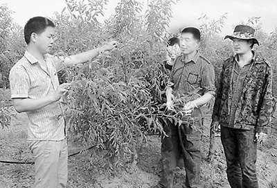 四十九团十八连连长陈辉(左)在指导职工红枣种植 何志江摄