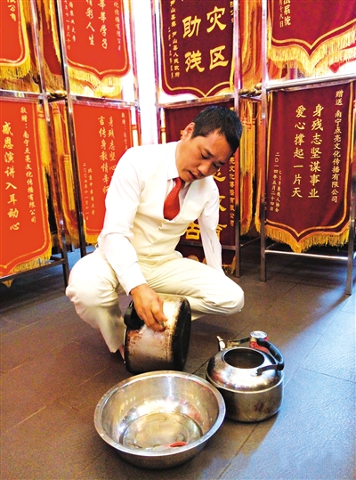 不久前,黄友在点亮公司演示擦锅时,动作还是那么老练。陈劲松摄