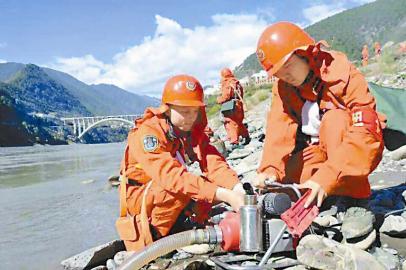 徐骅(右)和战士架设水泵准备灭火。 (武警四川省森林总队甘孜州支队供图)