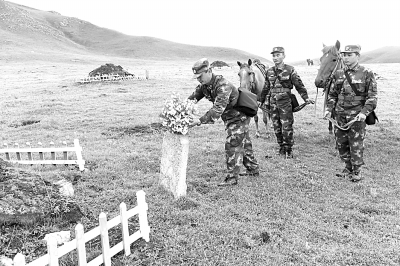 巡逻路上,九号哨所官兵为牺牲在战位上的烈士献花。陈小强摄