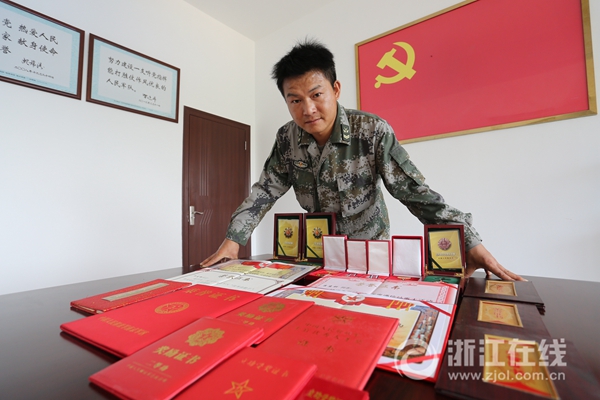 浙江省军区某通信连机动分队长吕应科就是个“黑人”老兵。当兵14年,吕应科的肤色从白到黑,见证的是一枚枚军功章。他的军事比武获奖证书、二等功证书、三等功证书、优秀士官证书等层层叠叠铺满了2平米多的桌子。