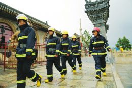 长年驻守在五台山景区的消防官兵努力践行“忠诚可靠、服务人民、竭诚奉献”的要求,采取防火巡查、现场执勤、与寺庙僧人开展联合灭火救援实战演练等方式,筑起了五台山文物古建筑消防安全的“防火墙”,确保了景区古建筑群连续24年未发生任何火灾,被誉为“神兵”“佛国卫士”……用实际行动默默谱写了一篇人民消防为人民的华章。图:消防官兵出警。左图:官兵日常巡逻古建筑。赵向南 焦瑾琦摄
