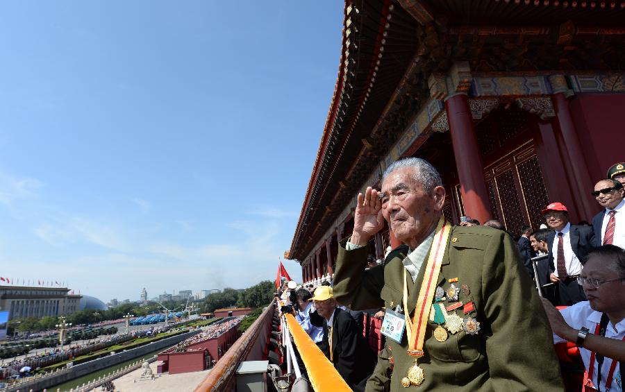 天安门城楼上出席纪念大会的部分抗战老战士、老同志代表。新华社记者 赵鹏 摄(资料图片)