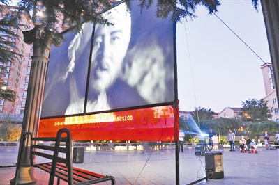 ⑧在石家庄市万信城市花园社区,市民正在小区广场欣赏抗战电影。该市为纪念抗战胜利70周年,牢记历史、缅怀英烈,组织了“千场电影进社区”活动,在全市多个社区巡回放映抗日主题经典电影。