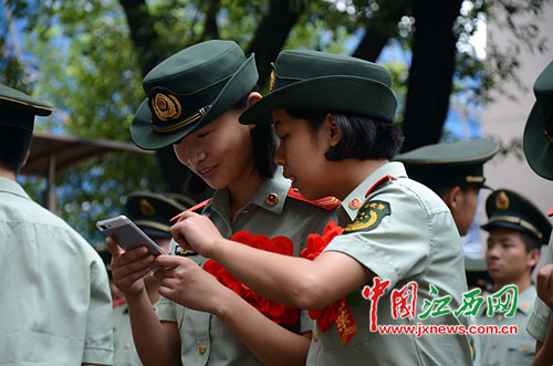 两名女兵正在相互保留联系方式。