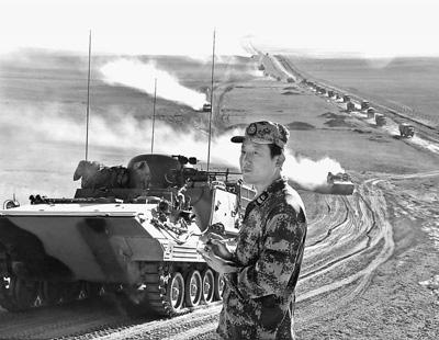 郭峰在实兵演习场上对培养新型装甲兵战斗员进行调研。张坤平摄(人民视觉)