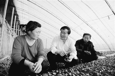 李双星(中)在大棚中查看瓜苗长势,并向农户分析市场行情。记者 史自强摄
