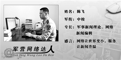 那段时间,陈飞白天专心备课讲学,晚上认真编审稿件,虽然起早贪黑,却乐此不疲。回忆起当初的情形,陈飞感慨:“没有对网络新闻的兴趣,没有为官兵服务的热情,干不了这份编外工作。”