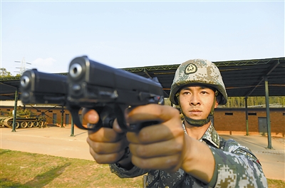 夏楠练习双枪射击,源于特战环境下既能快速应敌,又能把控两个射击方向。他自创口诀:“心要专,莫想环;眼要分,左瞄左、右管右;扣动扳机要平稳,勿让震动乱心神。”绝技非天成,还得“巧练+苦练”。为此,夏楠从早打到晚,晚上睡觉耳朵还嗡嗡作响;休息时他独自跑到靶场用手指替代手枪练瞄准、找感觉,平时还用两只手写字、吃饭。经过近3个月艰苦训练,双枪射击才算小成。此后,夏楠还增加难度,进行驾车射击训练,熟练掌握了手枪的装甲步战车乘车射击、溜索射击、滑降射击等技能。