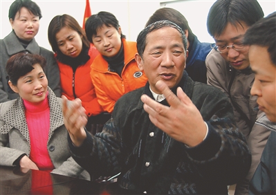 吴天祥与武汉市武昌区紫阳路房管所“吴天祥小组”的成员们一起座谈(资料照片)。 新华社发
