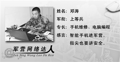 现在,邓涛“手机管家”的名声早已打响,团里打算为他和几位有同样特长的官兵成立业余工作室,一方面尝试开发适合军营的智能手机APP,一方面为战友们提供手机维修服务。别看邓涛只是个上等兵,因为技术出众,他已被大家推举成了工作室的室长了。