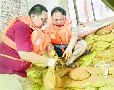 昨日中午父子俩加固龙王庙闸口 记者张宁 摄