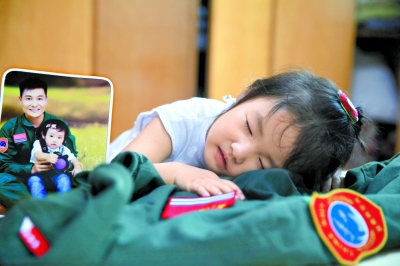 张超的女儿睡在爸爸生前最爱穿的飞行服上(7月18日摄)。