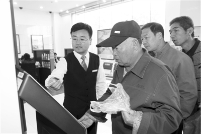 在大堂经理岗位的于清华(左一)帮助客户刷卡排号