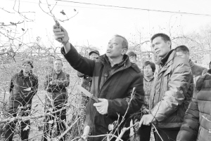 李保国(前左)在河北省内丘县岗底村向村民讲解果树修剪知识