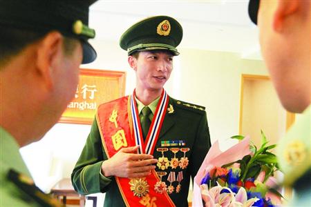28日下午,武警上海总队五支队特勤中队政治指导员李峰,在北京参加完武警部队组织的“十大忠诚卫士”表彰典礼后载誉返沪。