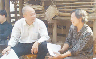 姜仕坤(左)到大田乡走访贫困农民。资料照片