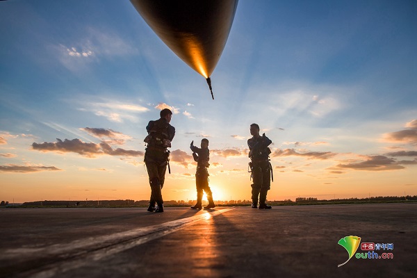 9月7日黄昏,空军“先锋飞行大队”飞行员在战机前进行二对一自由空战模拟演练。杨盼摄