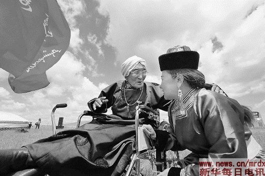 内蒙古呼伦贝尔市新巴尔虎左旗乌兰牧骑队员在牧区演出时和老人聊天(7月6日摄)。新华社发(东哈达摄)