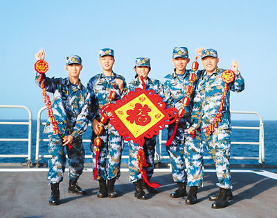 官兵们在军舰上给祖国和亲人拜年