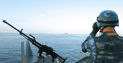 特战队员在观察不远处的被护商船