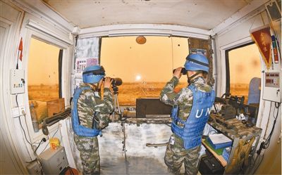 在马里北部加奥,中国维和部队官兵面对沙尘暴,坚守警戒岗位。中国赴马里维和部队供图