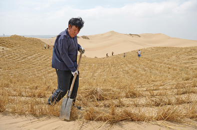 ▲在宁夏灵武市白芨滩国家级自然保护区,王有德在治沙一线扎草方格(2013年7月24日摄)。新华社记者王鹏摄