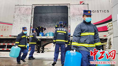 库里的防疫物资如酒精、口罩、防护服等都是极易燃烧的物质,如果发生火灾将会严重影响全县抗疫大局。作为执勤班长的他每天晚上都会对物资中转库进行巡查,关灯、断电这些小事一干就是一百多天。防疫物资装卸、搬运几乎是大队指战员每天都要面临的工作,25公斤一桶的消毒液一搬就是二三十吨,张士伦笑呵呵地和队友们说:“这不就是我们平时训练的搬运重物折返跑么,壶铃变成了消毒液桶而已嘛。”严寒的冬日里,豆大的汗珠沿着他的脸颊往下滴,却从来没听过他叫苦喊累。自1月26日物资中转库运行以来,张士伦累计参与搬运装卸防疫物资、生活物资19批次300余吨。
