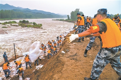 7月19日,空降兵某旅官兵到达受灾现场后,迅速向堤坝塌陷处运送沙袋。谢程宇摄