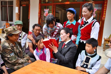 不久,法院又接到了一起离婚案,李金莲与合议庭法官一同前往维西县永春乡某村当事人家中进行调解。双方一见面就几乎吵起来,女方认为男方好吃懒做,挣的钱不仅仅要抚养孩子还要给男方生活费。男方坚决不同意离婚,他气愤地表示:“三年前,她说出去打工帮我还贷款,回来一句话不说就是离婚,让我没有面子!”李金莲将法官的调解,用傈僳族语言进行翻译并补充。李金莲耐心讲解,用傈僳语尽力安抚女方情绪,最终双方言和,达成调解。