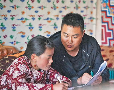 张元太正在为牧民家的孩子辅导作业。
